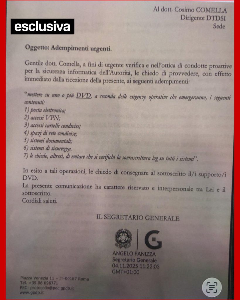 Poche ore fa è stato reso noto all’interno dell’Autorità un documento riservato in cui il Segreterio Generale chiedeva al dirigente del dipartimento informatico di provvedere urgentemente all’estrazione della posta elettronica, degli accessi vpn, degli accessi alle cartelle condivise, degli spazi di rete condivisi, dei sistemi documentali, dei sistemi di sicurezza.