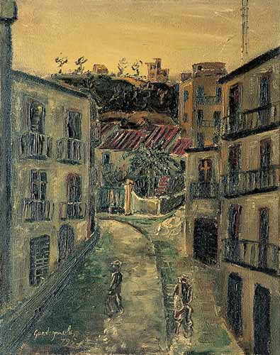 Nel piccolo olio su tela (50×60 cm), Guadagnuolo mescola toni di giallo, rosa tenui e grigio ardesia, restituendo il contrasto tra la luce dell’aurora e la silhouette metallica del traliccio. Il pennello, già sicuro e poetico, tratteggia fili di ferro come corde vibranti, mentre il cielo in dissolvenza sembra cantare un requiem per un gigante silenzioso.