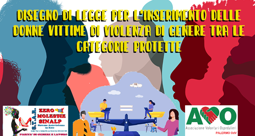 La Rete Zeromolestie SINALP con l’Associazione Volontari Ospedalieri AVO Palermo, e la Conf. Sindacale SINALP Sicilia, in linea con i principi statutari di tutela del lavoro dignitoso e di contrasto ad ogni forma di discriminazione e violenza, presentano e sollecitano la discussione e l’approvazione della proposta del Disegno di Legge presentato alle istituzioni, volto a potenziare gli strumenti di reinserimento sociale ed economico delle donne che hanno subito violenza di genere.