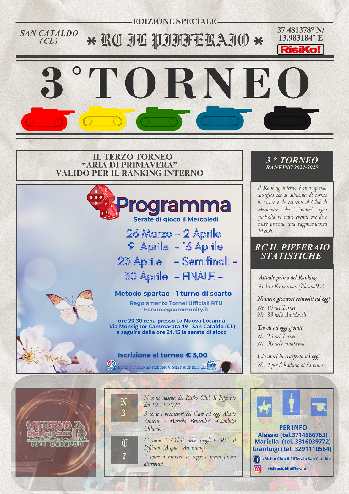 Caltanissetta 401 > News > Concorsi > Risiko Club IL PIFFERAIO San Cataldo (CL) 26.03.2025 – Inizia il 3° Torneo interno “Aria di Primavera”
