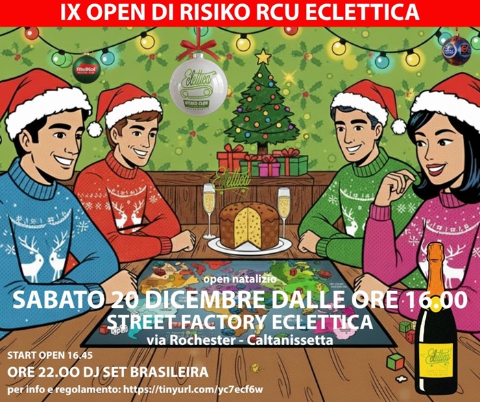 Domani sabato 20 dicembre dalle ore 16,00 in poi, presso Eclettica Street Factory, si giocherà il IX° Open di Risiko! (Open di Natale), valido per il Rancking Nazionale Live e per il Ranking interno “Eclettica”.