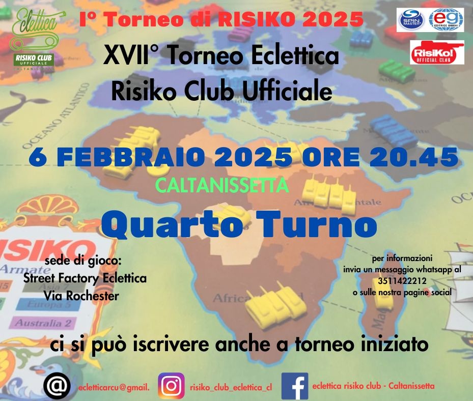 Domani giovedì 6, presso Eclettica Street Factory con inizio ore 20,45 (start 21,00), si gioca Il quarto turno del XVII° torneo (campionato periodico).