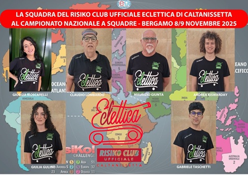 Intanto oggi la squadra del RCU “Eclettica” partirà, chi da Palermo, chi da Catania alla volta di Bergamo dove, presso il Palace Hotel Zingonia località Verdellino, si giocherà il XVIII° Campionato Nazionale a Squadre riservato ai Risiko! Club Ufficiali.