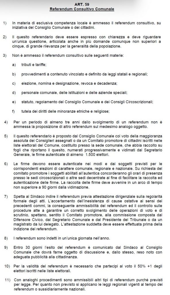 Abbiamo da tempo sostenuto che, come previsto dall’Art. 59 dello Statuto Comunale, vi è la possibilità del Referendum Consultivo Comunale, che rappresenta lo strumento democratico più idoneo per coinvolgere l’intera cittadinanza in una scelta così onerosa e rilevante.
