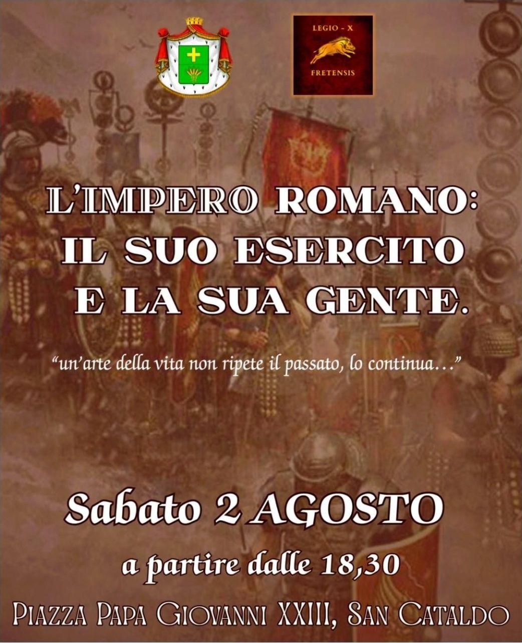 Sabato 2 agosto dalle ore 18:30 in Piazza Papa Giovanni XXIII a San Cataldo vi aspettiamo per un evento speciale di rievocazione storica dal titolo “ROMA IMPERIALE: IL SUO ESERCITO AL SUA GENTE”.