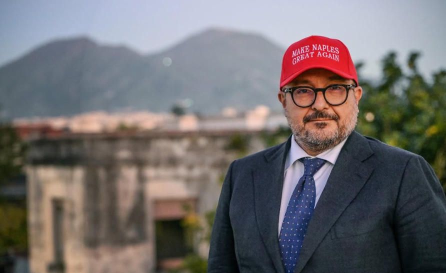 Sangiuliano come Trump con il cappellino rosso e la scritta “Make Naples great again”
