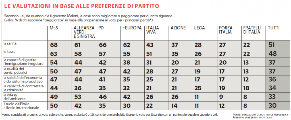 Pareri particolarmente critici vengono espressi dai sostenitori del M5S e di Avs sulle politiche relative all’ambiente e, insieme al Pd, sulla sanità. Mentre, al contrario, le critiche sfumano nella base di centrodestra.