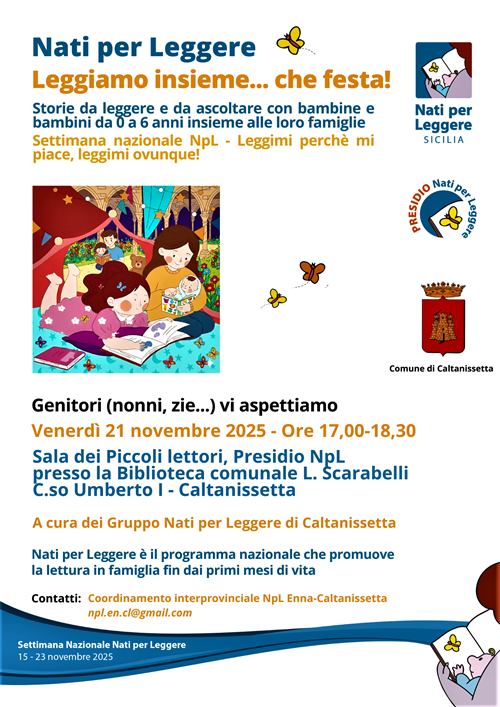 Dal 15 al 23 novembre 2025 torna la Settimana Nazionale Nati per Leggere, ed anche Caltanissetta parteciperà venerdì prossimo 21 Novembre dalle ore 17 alle ore 18.30 nella Sala dei Piccoli lettori della Biblioteca Comunale Luciano Scarabelli di Caltanissetta con l’evento “Leggiamo insieme … che festa!”, organizzato dal gruppo locale di Caltanissetta di Nati per Leggere, che invitano genitori, nonni e nonne, zii e zie a partecipare con i loro bambini e le loro bambine di età da 0 a 6 anni, per leggere a bassa ed alta voce libri creati appositamente per questa fascia di età.