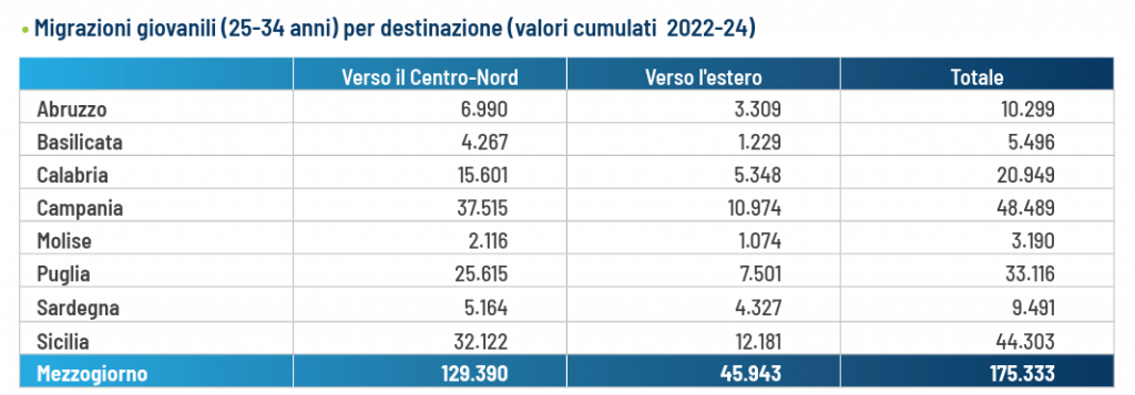 Tra i due trienni 2017-2019 e 2022-2024 le migrazioni dei 25-34enni italiani sono aumentate del 10%: nell’ultimo triennio 135mila giovani hanno lasciato l’Italia e 175mila hanno lasciato il Sud per il Nord e l’estero. Un paradosso evidente: più lavoro ma non migliori condizioni di vita, né opportunità professionali adeguate alle competenze.