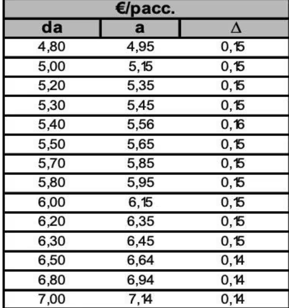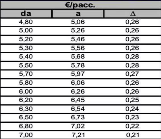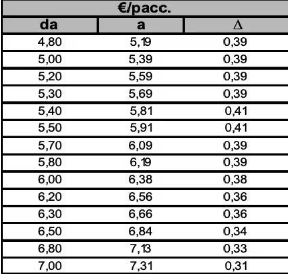 Ma si può stimare quanto aumenterà il costo di un pacchetto, in base a quanto costa oggi. I pacchetti nettamente più diffusi sul mercato oggi (circa due terzi del totale) sono quelli che costano tra 5,30 e 5,50 euro, e tra tre anni costeranno tra 5,70 e 5,90 euro. Ecco le tabelle allegate alla legge di bilancio con i calcoli del governo
