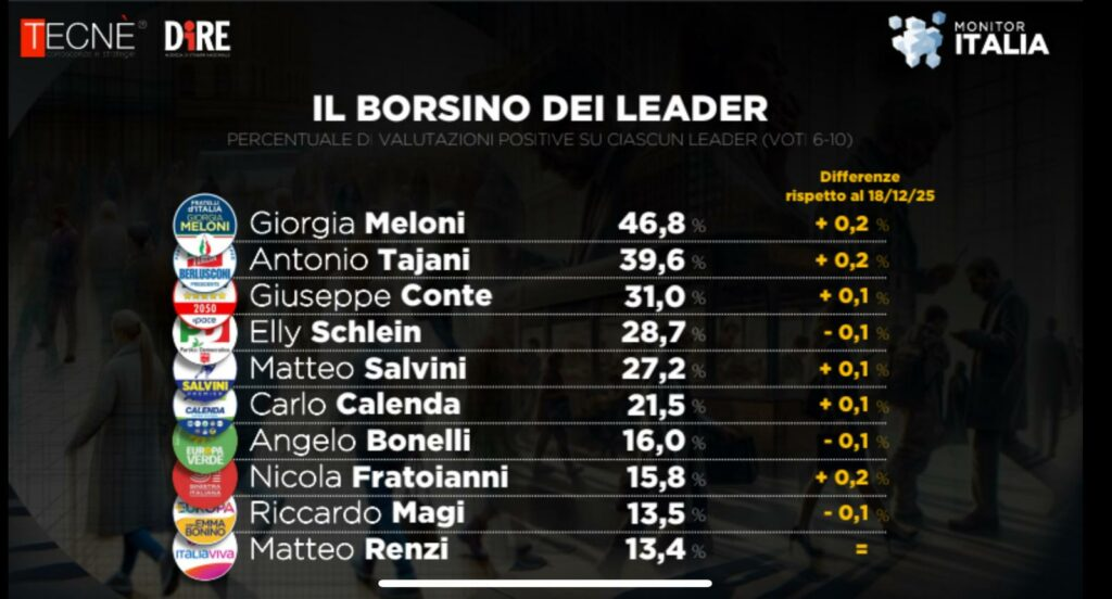 In seconda posizione si conferma il leader Fi, Antonio Tajani con il 39,6% (+0,2%), mentre nel gradino più basso del podio è stabile il presidente M5S, Giuseppe Conte con il 31% (+0,1%). A seguire la segretaria Elly Schlein che perde lo 0,1% e si porta al 28,7%. Quindi il capo del Carroccio Matteo Salvini, quinto, al 27,”% (+0,1%). A seguire il leader di Azione Carlo Calenda (21,5%), Angelo Bonelli (16%), Nicola Fratoianni (15,8%); Riccardo Magi e (13,5%) e Matteo Renzi (13,4%).