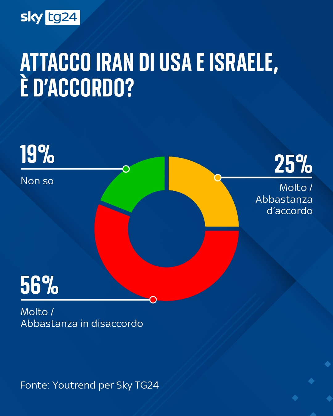 - Il 56% degli italiani si dichiara in disaccordo con l’intervento militare congiunto di Stati Uniti e Israele contro l’Iran (il 25% è d’accordo, il 19% non si esprime). La contrarietà è prevalente in tutte le fasce d’età e tra entrambi i generi, con un divario particolarmente ampio tra le donne (55% in disaccordo, 20% d’accordo). È quanto emerge dal sondaggio di YouTrend realizzato per Sky TG24.