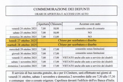 Riceviamo rettifica, su quanto precedentemente pubblicato sugli orari di apertura del cimitero…