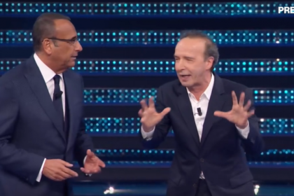 Nella serata dei duetti l'attore e regista toscano entra in scena travolgendo…