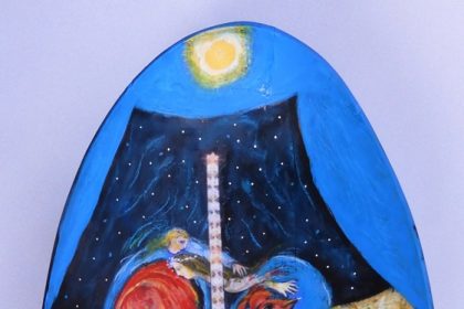 Sul fondo di una tavola curvata a forma di mandorla che evoca…