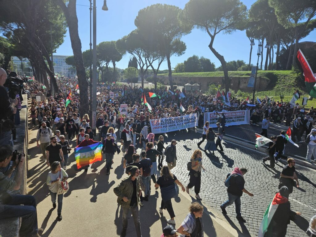 Migliaia di persone si sono riunite nel primo pomeriggio a porta San Paolo, pronte a manifestare per la Palestina. Tante le bandiere nera, bianche, verdi e rosse. Tantissimi giovani, ragazzi e ragazze. ‘Stop complicità con Israele – contro occupazione e genocidio per la resistenza palestinese’ recita il grande striscione che apre la manifestazione, tenuto dalla comunità palestinese. “Siamo un milione“. È l’annuncio, accolto dal boato di piazza San Giovanni, degli organizzatori della manifestazione per la Palestina. “Roma è bloccata. Roma rappresenta tutta l’Italia, dal nord al sud. Siamo al fianco della causa palestinese e della giustizia per il popolo palestinese“, hanno detto. E mentre la testa del corteo è arrivata a destinazione, la coda è ancora al punto di partenza, a porta San Paolo, nel quartiere Ostiense.