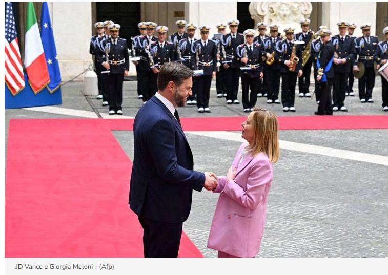 Vance ricambia, chiarisce gli argomenti sul tavolo, augurandosi il buon esito della trattativa sul conflitto in Ucraina: ”Abbiamo un paio di questioni importanti da discutere: voglio aggiornare la premier su alcuni dei negoziati tra Russia e Ucraina e anche su alcune cose che sono successe nelle ultime 24 ore. Siamo ottimisti sul fatto che si possa sperare di poter porre fine a questa guerra così brutale”. L’altra questione sono i dazi: “Stiamo avendo importanti negoziati commerciali non solo tra Italia e Stati Uniti ma con tutta l’Unione Europea, ne abbiamo parlato a lungo ieri con il presidente e daremo seguito a quelle conversazioni oggi”, fa sapere il vice di Trump. E del colloquio di ieri alla Casa Bianca, la premier aggiorna anche la presidente della commissione europea, Ursula von der Leyen.